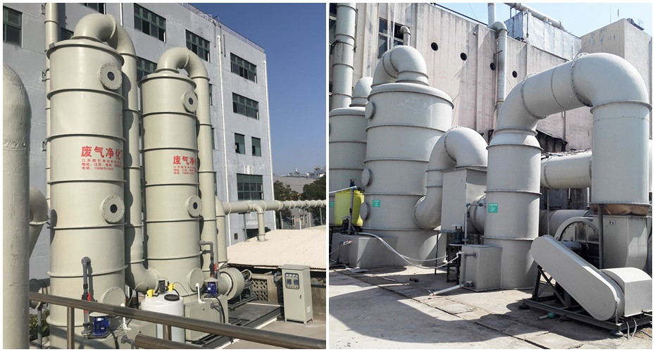Под действием вентилятора выхлопные газы достигают нижнего наполнительного слоя и на низкой скорости входят в камеру равновесия давления, образованную внутренней и внешней оболочкой, транспортируются циркуляционным насосом и промываются противотоком. Выхлопные газы равномерно распределены вокруг слоя многогранных полых шаров с колючим венком PP Terrary + PP, каждый из которых находится в контакте с точками, расположенными по нерегулярному пути « Z или W» без отклонения. Затем используйте спираль высокого расхода, не блокируйте сопло, так что скорость двухфазного смешивания газа и жидкости достигает более 97%, так что выхлопные газы получают реакцию полного двухфазного контакта газа и жидкости, а затем путем дегидратации и удаления тумана, чтобы соответствовать требованиям вторичного сброса в национальных стандартах выбросов загрязнителей атмосферы GB16297 - 1996, а затем через выхлопную трубу в атмосферу.